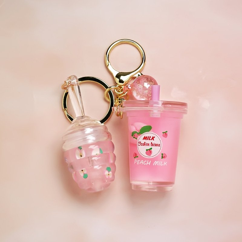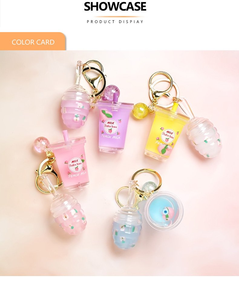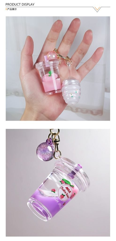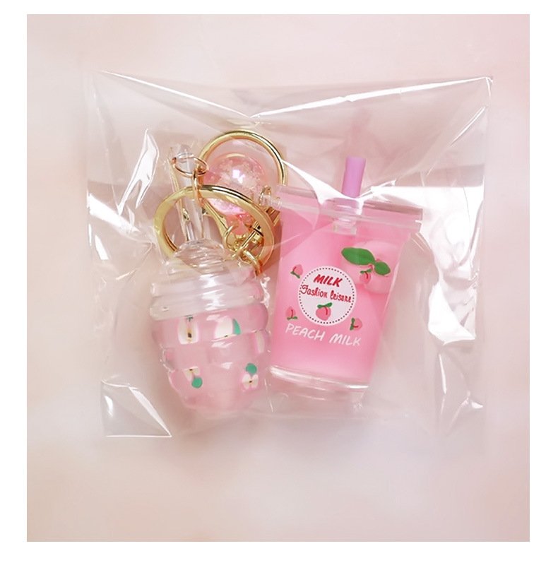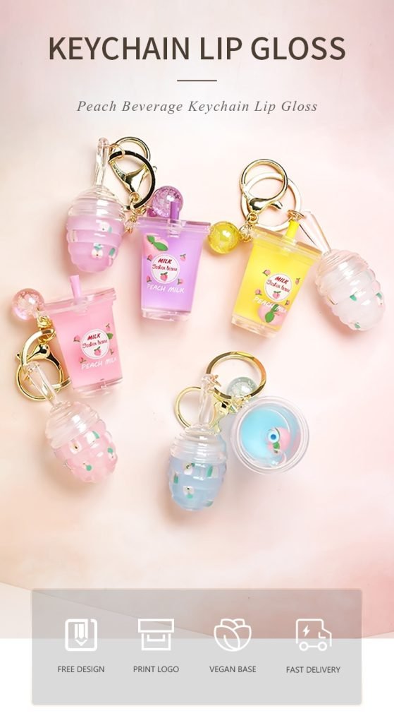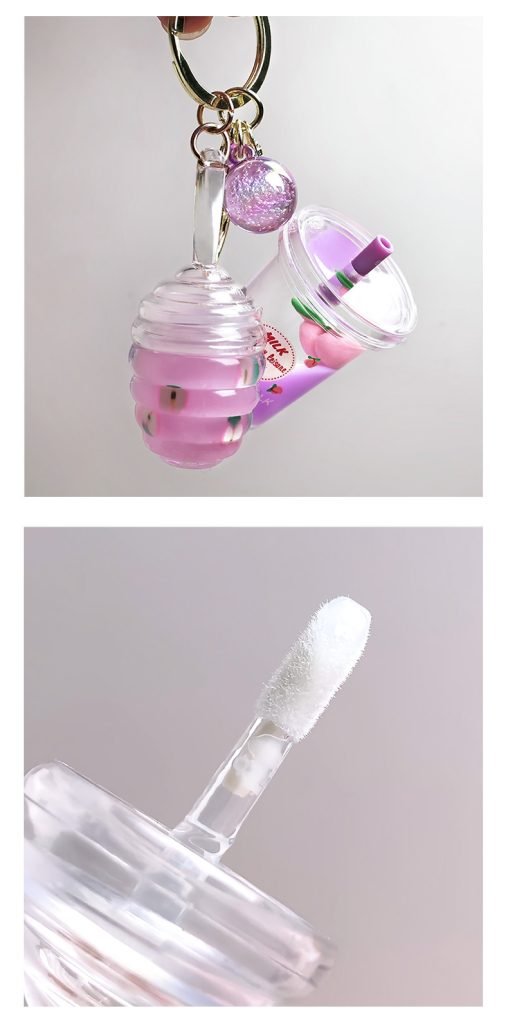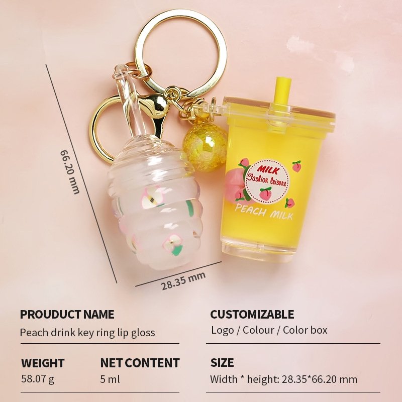 Private Label Mini Cute Milk Tea Bottle Peach Lip Gloss With Keychain Moisturizing Lip Gloss Oil Kids Lip Gloss Balm